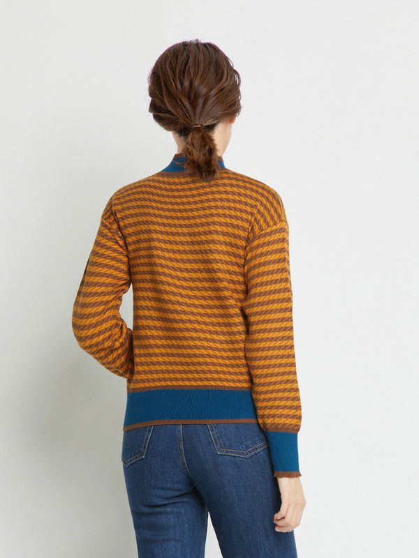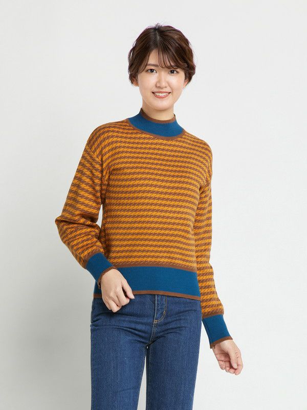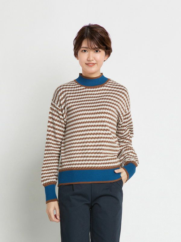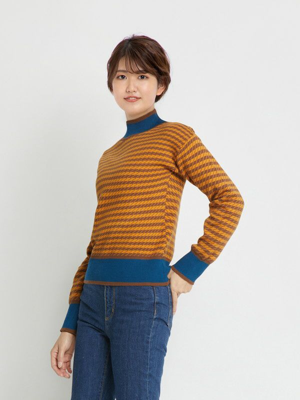 ブルーの配色が利いたプチハイネックのニット。