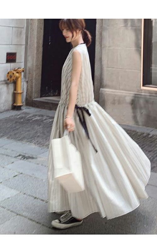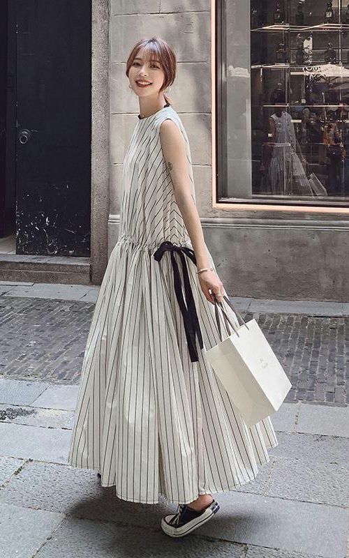 大きなフレアシルエットが涼し気なストライプ柄のワンピース。ウエストのリボンとアシンメトリーネックがデザインのアクセントなっています。