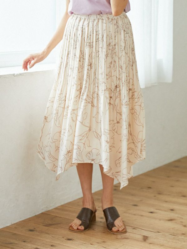 プリーツとアシンメトリーの裾がアクセントに引き立つ、女性らしさのあるデザイン。