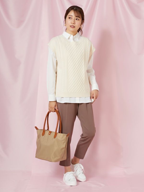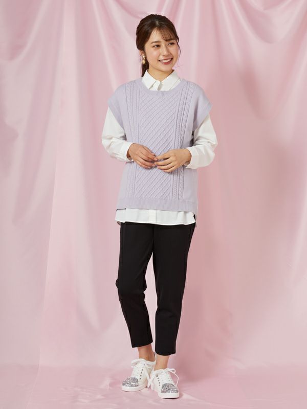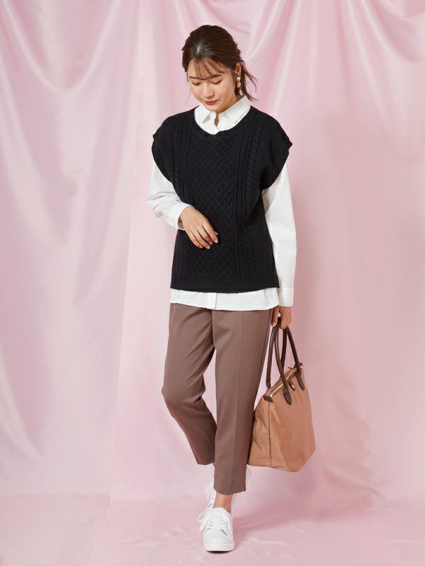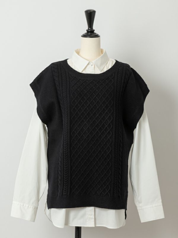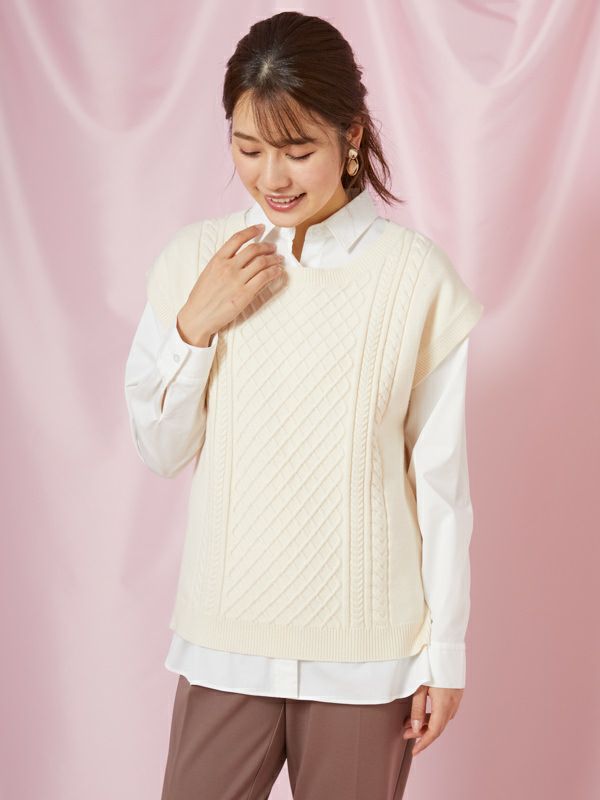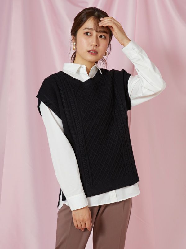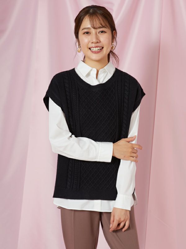 ニットベストの程よいルーズなサイズ感と立体的なケーブル編みが魅力的。