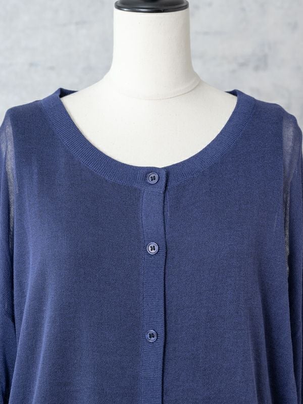 トレンドの透け感を品よく楽しめるハイゲージのカーディガンは、ほどよくボリュームのある袖とゆるめのシルエットがポイント。
