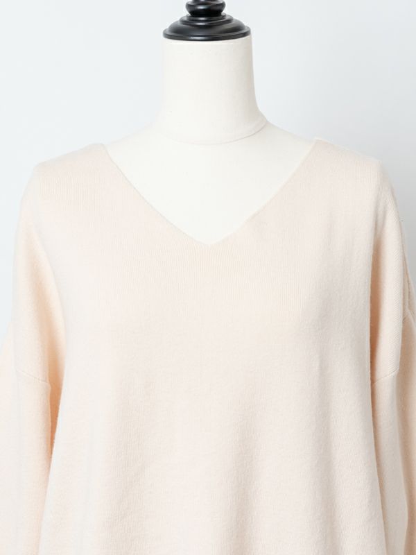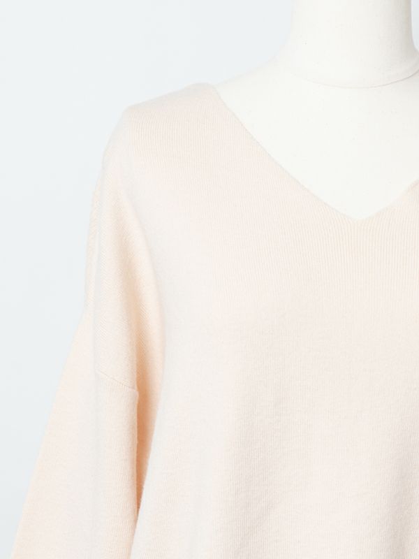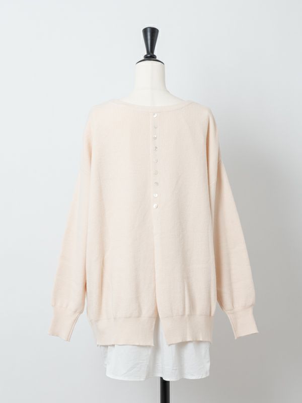 シンプルなVネックニットはバック部分にシェル風のイミテーションボタンを施し、ディテールまでこだわったアイテム。