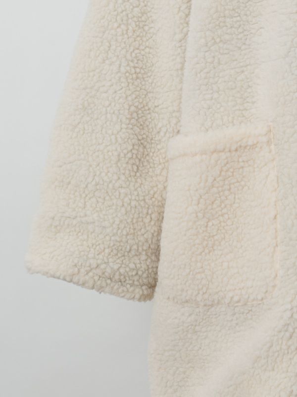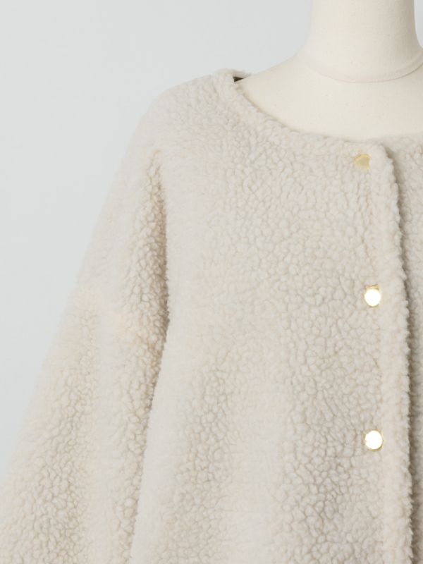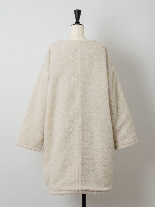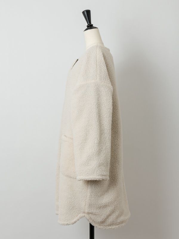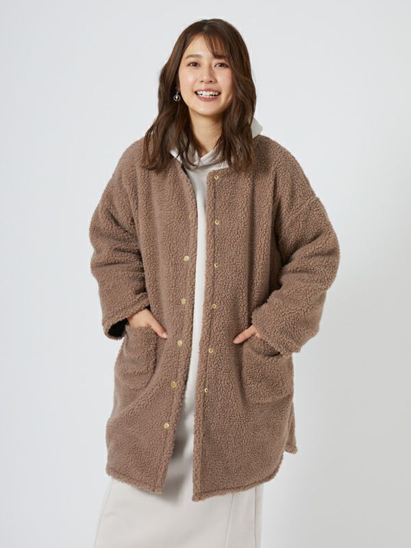 カジュアルになりがちなボアは、ノーカラーのネックラインと程よいロング丈で大人の女性らしい雰囲気に◎